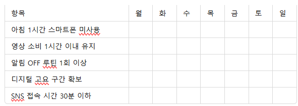 매주 일요일에 점검표를 스스로 채워보며, 건강한 디지털 습관을 시각적으로 확인해보세요. 루틴화된 점검은 습관의 지속성과 개선 동기를 높이는 데 매우 효과적입니다.