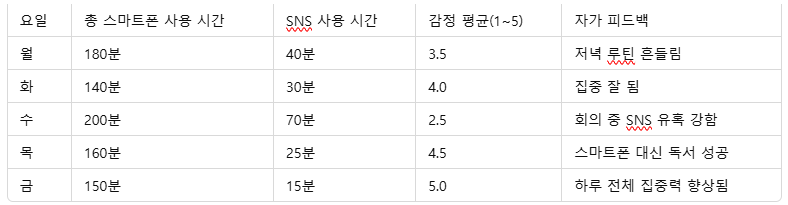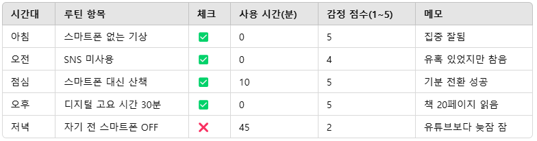 - 예: 오후 9시 이후 스마트폰 OFF, 점심시간 중 SNS 금지 등